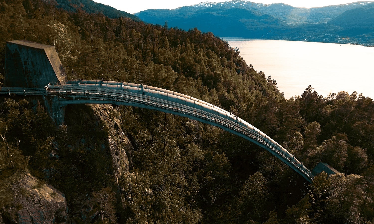 Det går tursti langs rørgaten og for de som ikke er plaget av høydeskrekk er turen over over Buen en forfriskende tur med nydelig utsikt over Sauda.
