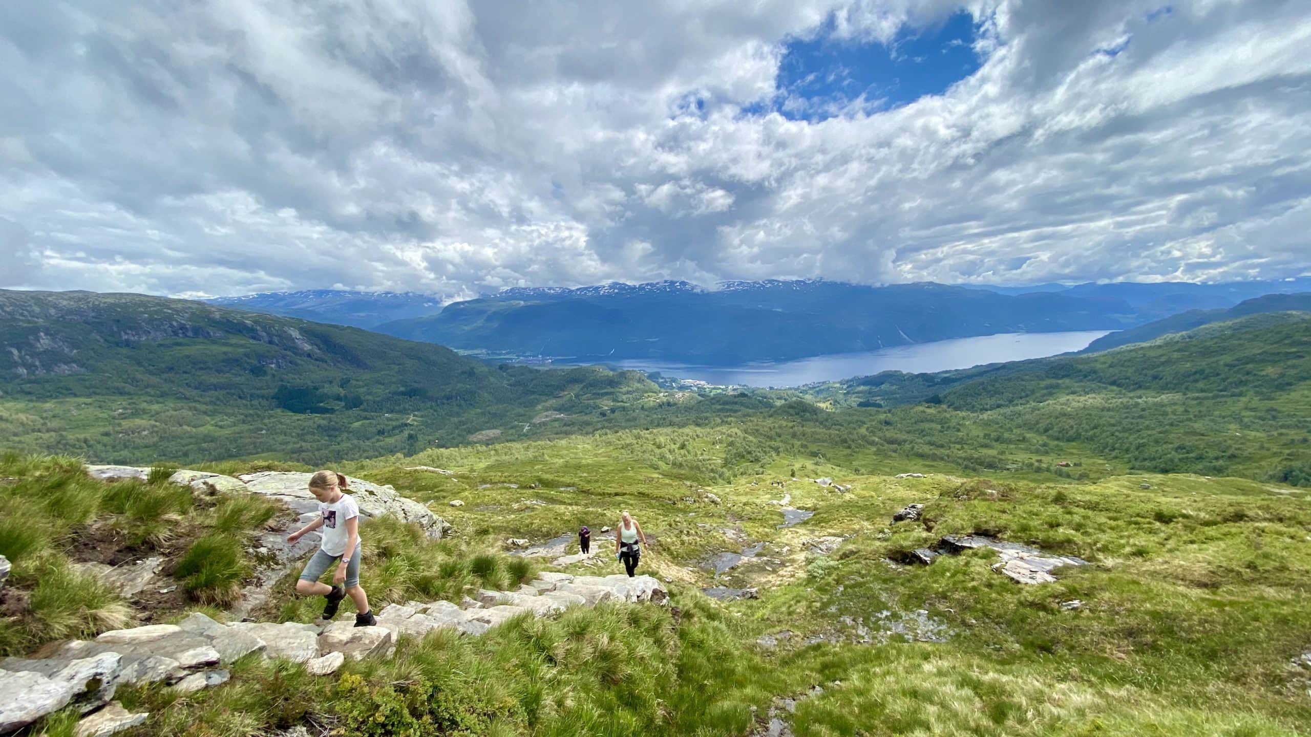 Øverst mot toppen er det mer steinete. man runder nuten bak på nordsiden, og får til slutt belønning med fantastisk utsikt mot Saudafjorden.