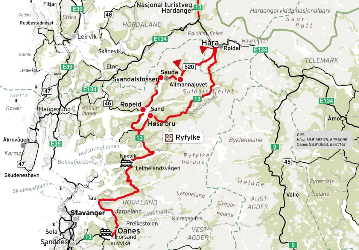 Reisa langs turistvegen i Ryfylke er ei reise i kontrastar. Her møter du nakent høgfjell, frodige lier, stupbratte fjellsider og djupe fjordar. Saudafjellet har ein særeigen natur. Den er knudrete, rå og gjenstridig og du kan ta deg i å lure på kva i all verda fekk nokon til å leggje ein veg akkurat her. Ved Svandalsfossen kan du gå i trappene og verkeleg kjenne på både vatnet og kreftene. Nokre gonger har fossen så kraftig vassføring at politiet må trå til og sleppe ein og ein bil gjennom vasskya som dekkjer vegen. Akkurat dette er nesten litt eksotisk. Lengst sør på denne vegen finn du Lysefjorden. Lysefjorden er kanskje på sitt aller vakraste når mørke skyer heng over fjorden og berre slepp små striper av gyllent ljos gjennom. Sidan Ryfylke er ei lang og variert strekning, så kan det være lurt å bruke god tid. Her er det mange stader råd å ta små avstikkarar og ta pausar undervegs, anten du er nysgjerrig på industrihistoria i Sauda eller berre vil oppleve ein av dei flotte strandstadane som til dømes Sand. Langs denne ruta kan du delta på laksesafari og rafting eller leggje ut på ein fottur i skiftande terreng. Kjøreturen gjennom Ryfylke er ei allsidig oppleving på ein røff veg med mange sjarmerande sider.